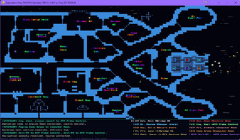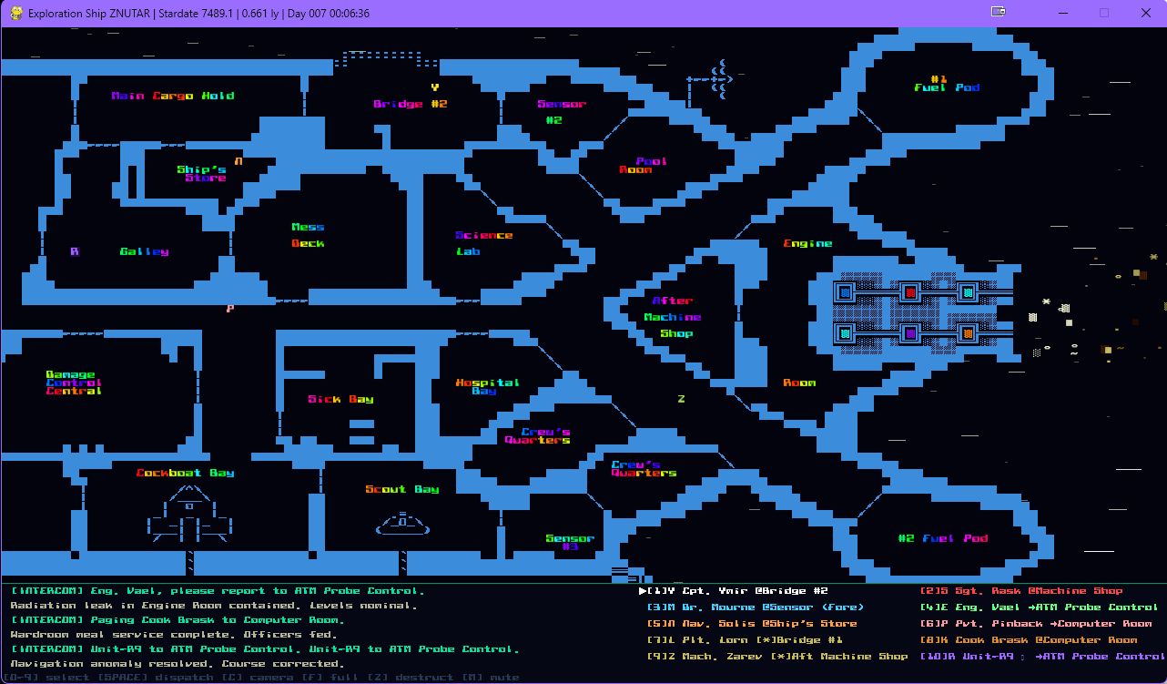 Ten crew members go about their duties. You can follow them around by selecting them with the keys 0 through 9. (0 is the the robot R9.) 'C' key toggles to free camera movement via the arrow keys. Space bar will dispatch your selected crew member on an assigned ship duty. There are also various alerts (radiation, air leaks, fires, etc) that crew members will be ordered to go and fix. And there's always the threat of a parasitic alien invasion by Awful Green Things!